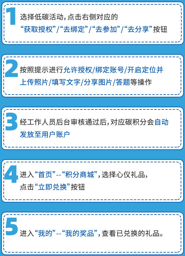 碳积分的获取方式很简单。用户在日常生活中进行绿色出行、绿色消费、绿色回收、绿色宣传活动时,打开“低碳军运”小程序点击“去参加”,依次进行拍照、定位、提交操作,通过审核后就可以获得碳积分。比如“自备购物袋”,在门店外,给自己自备的购物袋拍照、定位、提交,就可以获得“碳积分”。